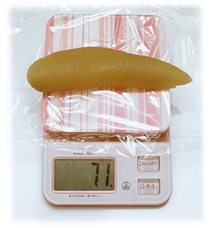 この塩カズノコ原卵と干しカズノコを比較するために、最大でも最小でもない重量のものを選んで、その重さを量った。