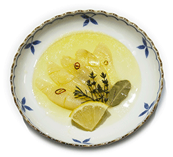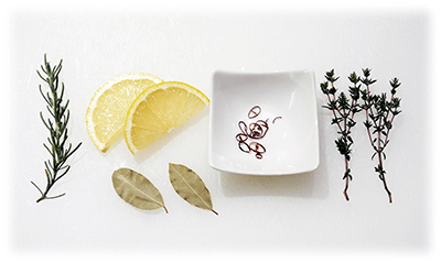 <材料> タイム、ローリエ、レモン、赤唐辛子、ローズマリー、オリーブオイル、ニンニクスライス <ポイント、及び注意点> 1本ものは形を重視して、いっさい包丁を入れない |