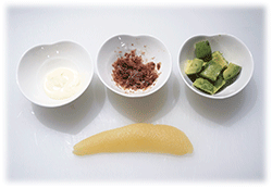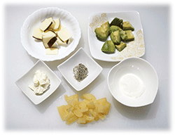 <材料> カズノコ、クリームチーズ、ヨーグルト、リンゴ、アボカド <ポイント、及び注意点> クリームチーズは生食用を使う |