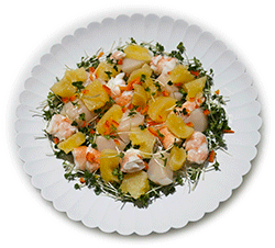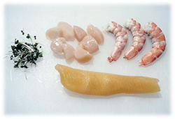 <材料> カズノコ、ホタテ貝柱、ボイルエビ、カイワレ <ポイント、及び注意点> @ボイルエビは1.5pほどにカット Aカズノコは適当な大きさにちぎる。Bホタテ貝柱4Sは半分にカット。 |