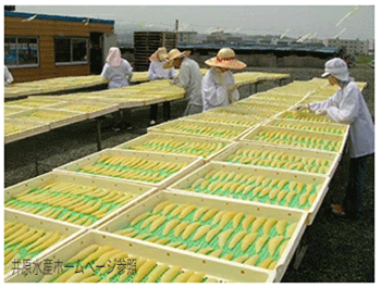 井原水産が位置する北海道の留萌市において、初夏の晴天が続きそうな日を選び、会社が仕入れた数多くの前浜もの抱卵ニシン原料の中から、色・ツヤ・大きさ・形などの点で極上の魚卵を選び出し、その選りすぐりの魚卵を屋外で一斉に天日干しするということだ。そして5日間にわたって約2時間おきに一本一本手作業で丁寧に裏返しながら、それらを均一に乾燥させるとのことだ。