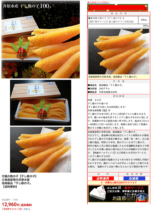 以下の画像はネットショップのスクショであるが、2025年11月時点で干しカズノコは、内容量100gのものが12,960円で販売されていた。